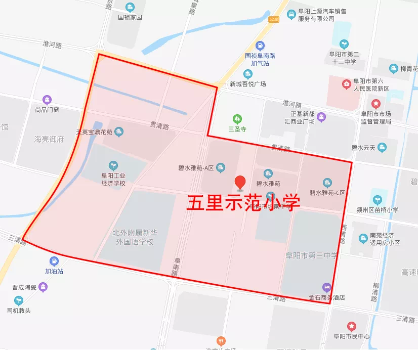 2020年学区范围为:①东至西清路,南至卜子东路,西至五里路,北至淮河路;②东至颍淮大道,南至八里松路,西至西清路,北至淮河路;③东至西清路,南至八里松路,西至五里路,北至三清路,具体范围如下图: