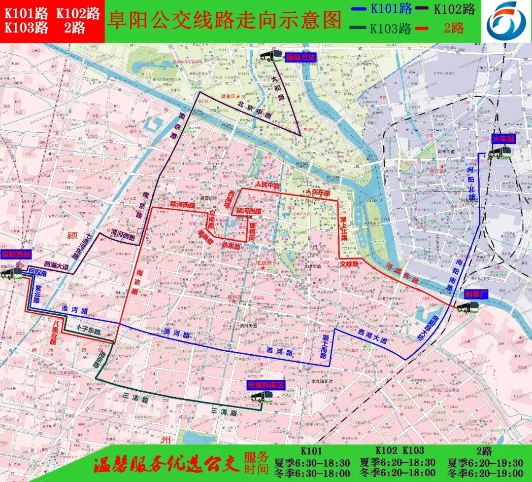 2、线路具体走向:阜阳西站—何园路—紫云路—淮河路—颍上南路—西湖大道—向阳路大桥—向阳路—火车站。