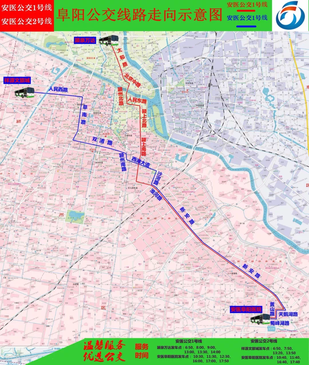2、线路具体走向:祥源文旅城—人民西路—阜南路—双清路—颍州南路—西湖大道—沙河路—淮河路—新安路—天鹅湖路—黄山路—蜀峰湖路—安医阜阳医院。