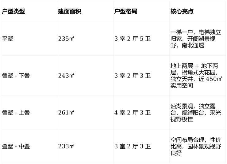 项目作为主城湖心纯墅,定位高端改善,建面 235㎡平墅总价 550-650 万元 / 套,建面 243㎡叠墅总价 650-1200 万元 / 套,建面 261㎡沿湖上叠总价更高,总价门槛高于武汉主城普通住宅,适合改善型家庭与高净值人群,刚需群体难以承受。