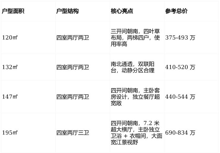 195㎡四室两厅三卫:参考总价690-834 万,单价约35385-42769 元 /㎡,主打大平层改善,江景视野极佳,面向高端改善及改善型投资客群。