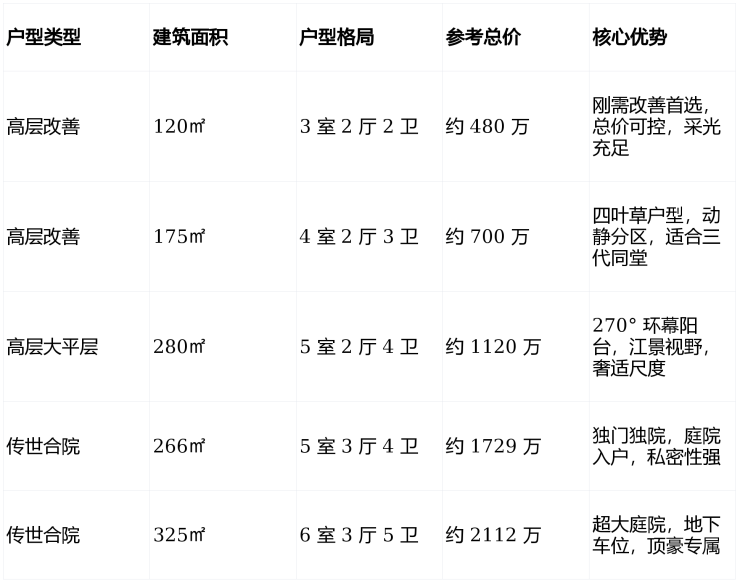 户型设计:所有户型均采用南北通透布局,大面宽、短进深,保证采光与通风效果。高层产品120㎡户型为经典三房,满足刚需改善需求;175㎡户型为四叶草户型,动静分区明确,适合三代同堂;280㎡大平层采用270° 环幕阳台,可 360° 欣赏江景与园景,餐客厅面宽达10 米,可满足私宴接待需求。合院产品采用独门独院设计,庭院面积约50-150㎡,配备地下双车位,实现 “有天有地” 的庭院生活。