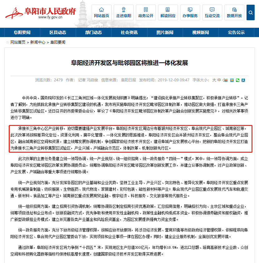 由中共阜阳市委办公室 阜阳市人民政府办公室关于印发的《阜阳经济开发区毗邻园区体制改革产业融合创新发展实施意见》(阜办发〔2019〕9号)全文发布!