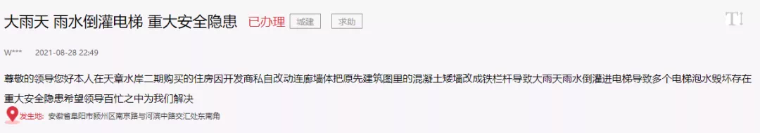 近日,有网友在人民网留言投诉“小区雨水倒灌进入电梯”问题对此阜阳市城乡建设局进行了回复 网友投诉: 尊敬的领导您好本人在天章水岸二期购买的住房因开发商私自改动连廊墙体把原先建筑图里的混凝土矮墙改成铁栏杆导致大雨天雨水倒灌进电梯导致多个电梯泡水毁坏存在重大安全隐患希望领导百忙之中为我们解决! 2021