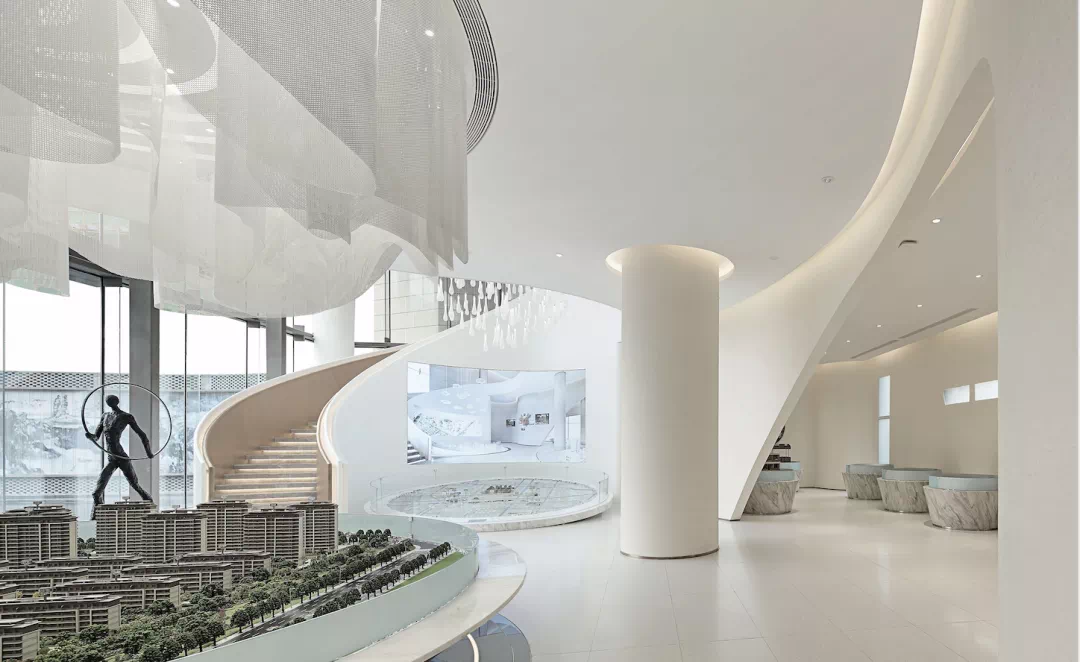 示范区建筑内部也充满着科技感与艺术感,大面积的玻璃墙面很成功地将外部景观引入室内。