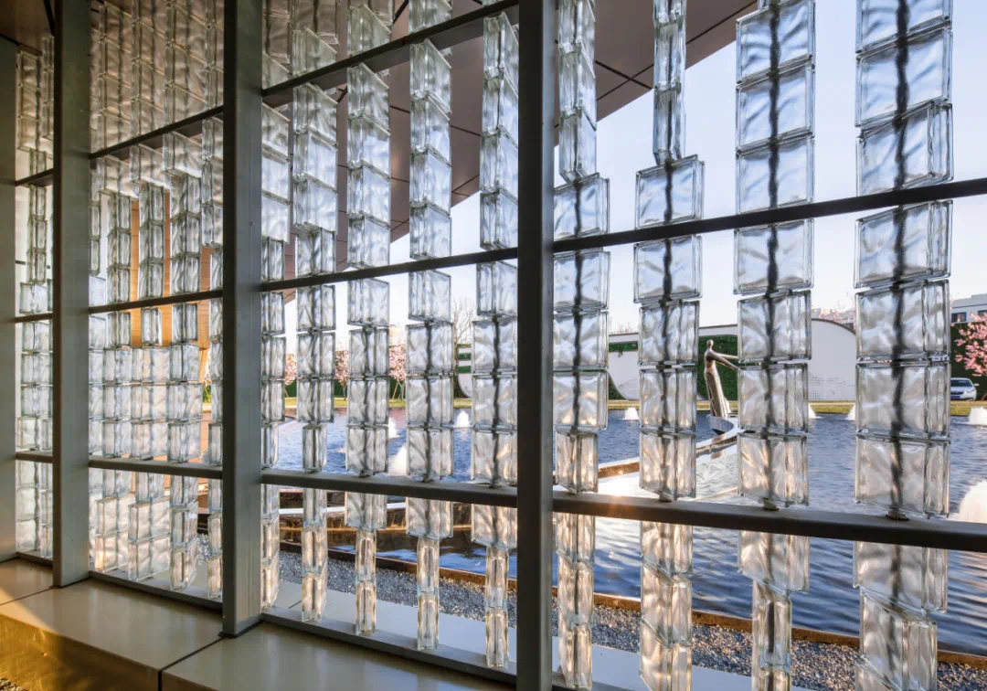 建筑立面的构架式幕墙搭配收边朱红色空心水波纹玻璃砖和收边无色空心水波纹玻璃砖,砖的变向形成了立面的渐变起伏,宛如一条长龙从地面升腾而起。