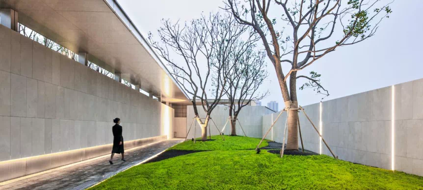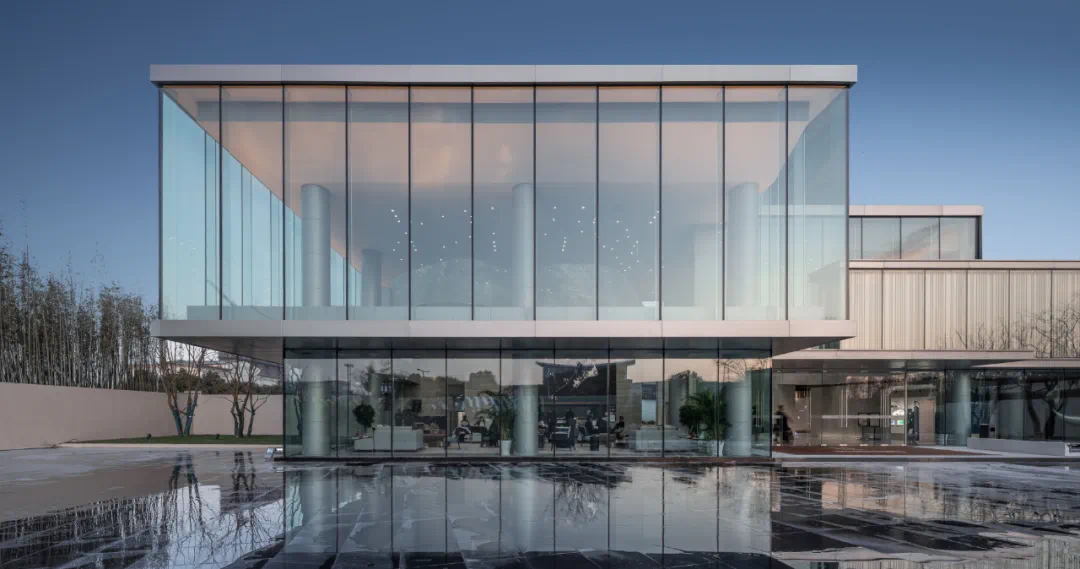 建筑二楼玻璃幕墙所对,是一孤岛树荫,二者同泊于水幕之上,留下一地清幽,宛如诗意栖居之所。