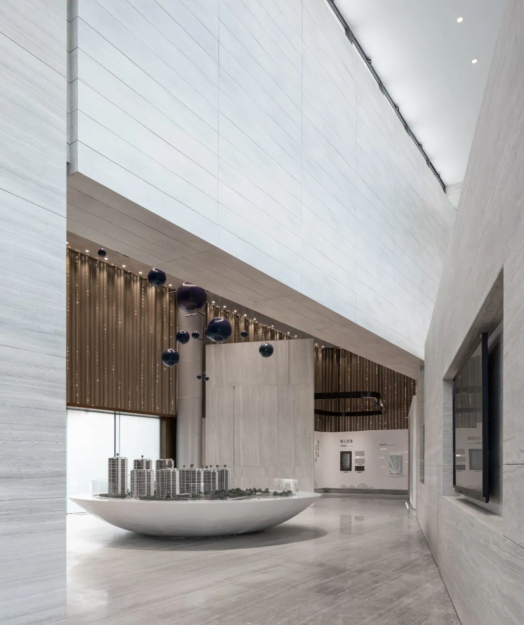 落座在示范区的洽谈区,看大尺度的玻璃幕墙与水镜相对,通透晴朗,虚实相融,柔化空间。斜面的大厅天窗体,将星光轻洒而下,遁入水中,将天地相接,以自然生成人居仪式。