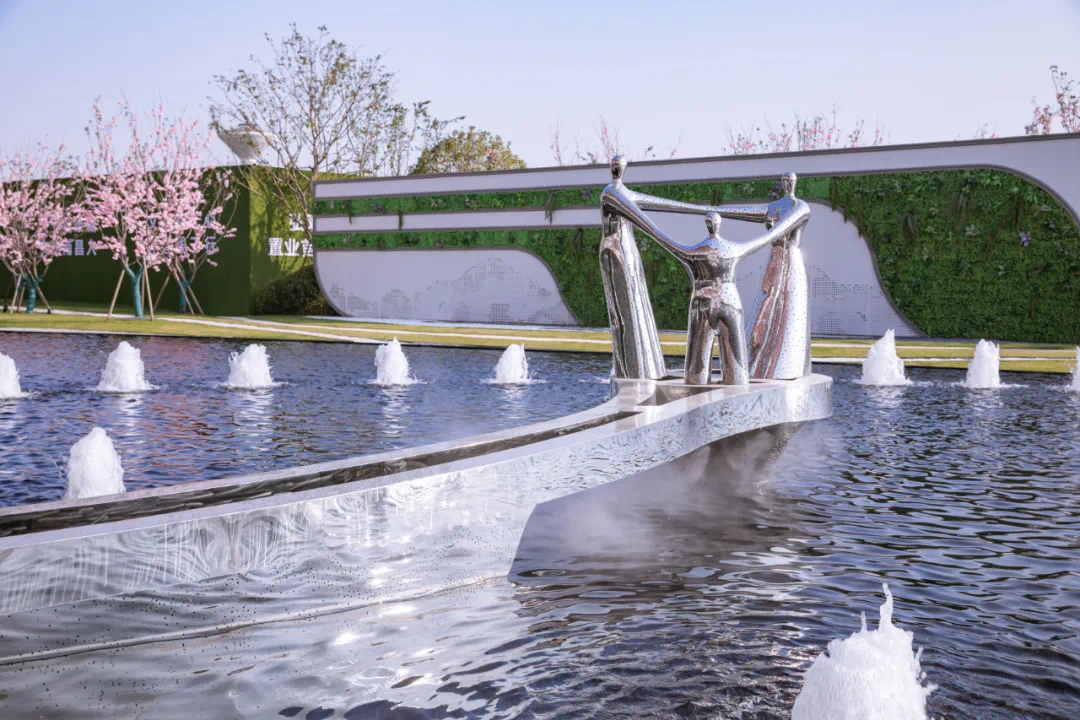 雕塑——《飞越》的设计源于展翅腾飞的翅膀造型,以线条的重复排列形式增加作品的韵律感与张力,在夜间灯光中闪烁出空间的生机与冀望。另一座雕塑以人物手拉手的组合表现温馨、快乐的家庭时光。