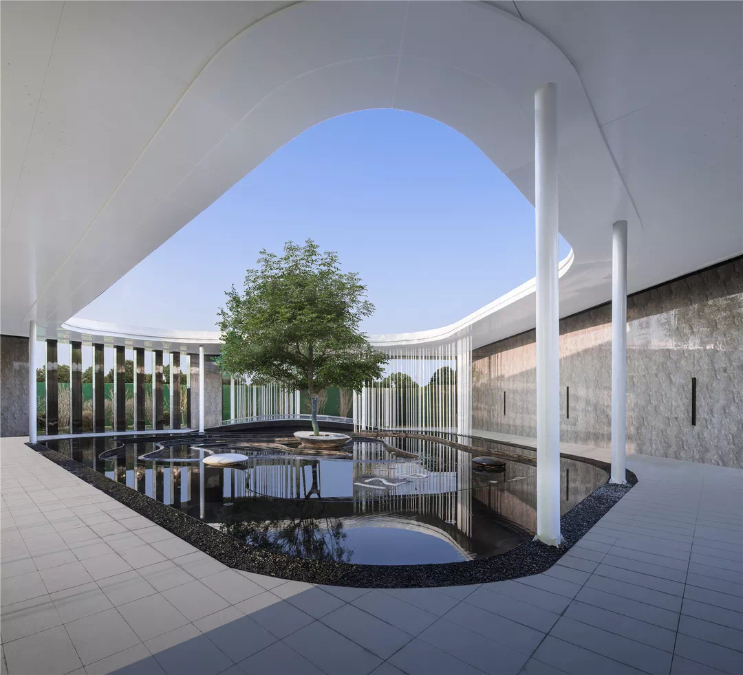 展示区中央无遮挡的露天水池,作为连接自然与通透空间的视觉纽带,含而不露,轻盈的飞檐与镜面水景之上的雕塑互相吸引,偶有水帘落下,别有“泉眼无声惜细流”的韵味。