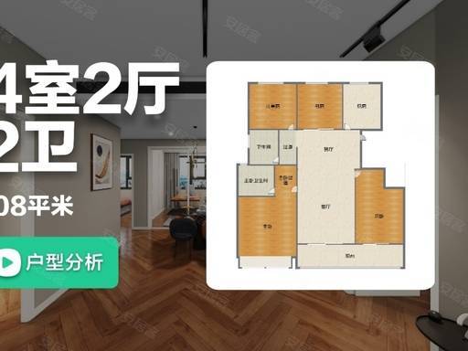 建面约 108㎡四房两厅两卫:四叶草格局,卧室分布四角,互不干扰,小面积实现大四房。