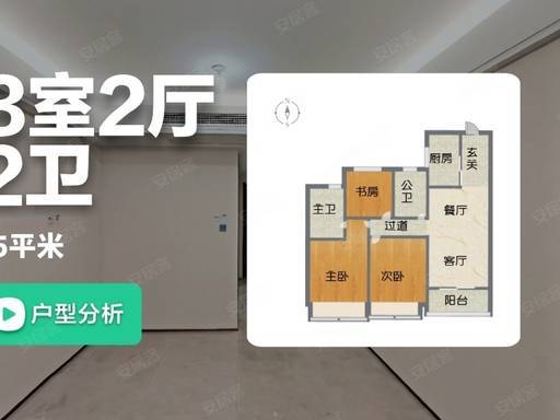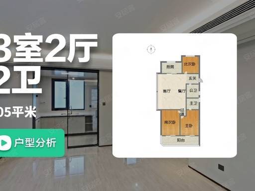 建面约 95㎡三房两厅两卫:南向三开间,餐客一体连通阳台,双卫配置,刚需优选。