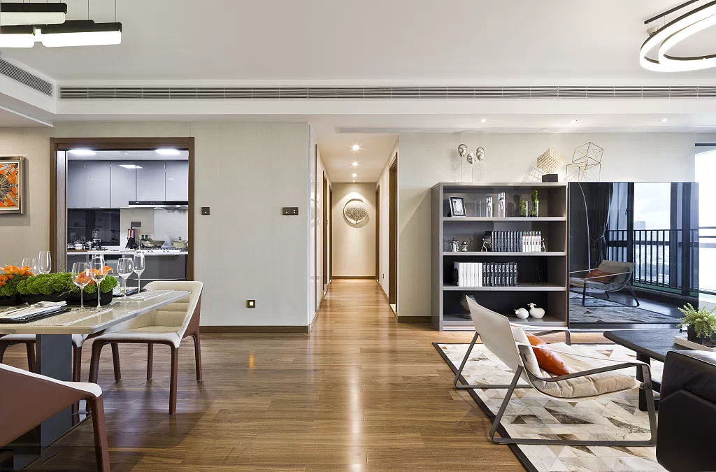 闲暇时,于敞阔宽厅里,与家人喝茶聊天,舒适、惬意,带来美好的生活体验。或孩子生日party,或家族聚会,都绰绰有余,为居住者带来较大限度的空间自由感。