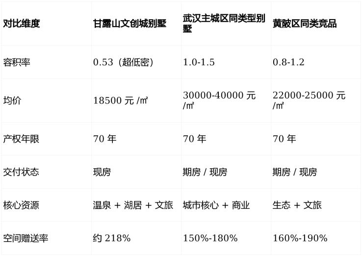 从对比可见,甘露山文创城别墅在容积率、价格、空间赠送率等核心维度具备显著优势,同时依托国企开发与现房交付,降低了置业风险,是武汉北改善置业的高性价比选择。